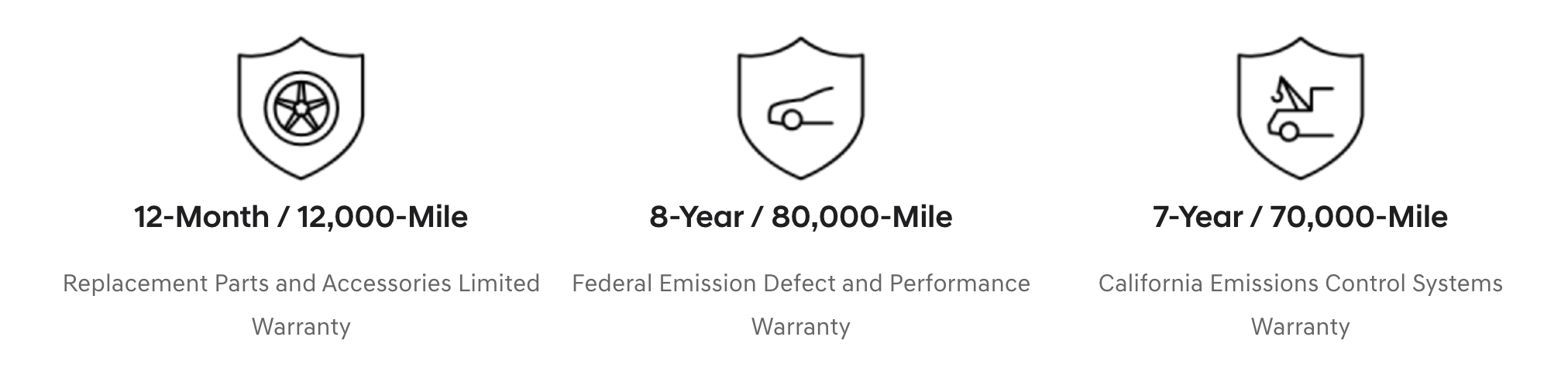 Applies to vehicles manufactured to California specifications, which are distributed by Hyundai Motor America and registered in the states of California, Connecticut, Maine, Maryland, Massachusetts, New Jersey, Oregon, Pennsylvania, Rhode Island, Vermont or Washington. Covers repair or replacement of specific original Hyundai emissions components (specific covered emissions components vary by model). California Emission Control Systems Warranty is in addition to Federal Emission Defect and Performance Warranty. Other California Emission Control Systems Warranty emission warranty parts are covered under the 5-Year/60,000-Mile New Vehicle Limited Warranty.