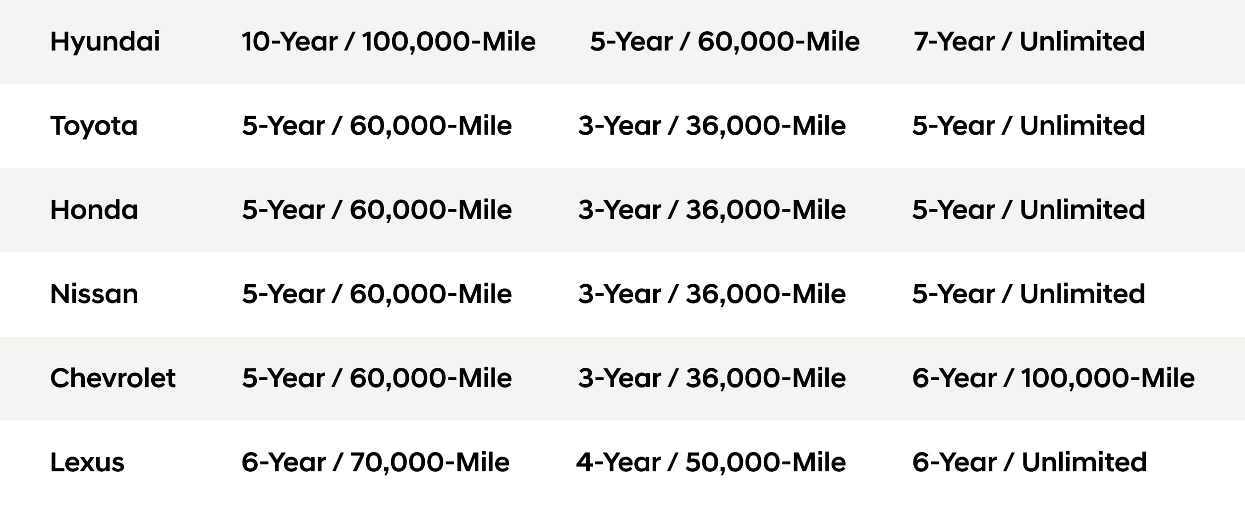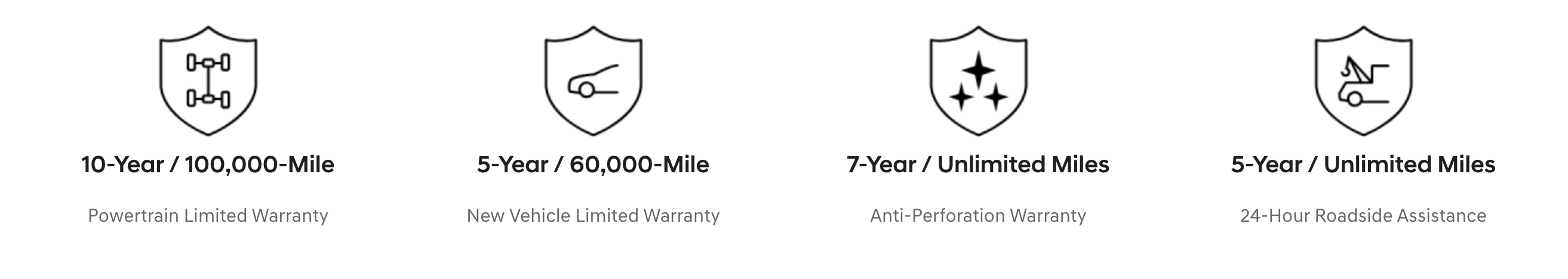 We are committed to giving you the confidence and peace of mind that comes with knowing your Hyundai is built with the highest quality and care. That’s why we cover our batteries and system components for our hybrid, plug-in hybrid, and all-electric vehicles with a 10- year/100,000-mile warranty. While all electric-car batteries will experience degradation over time, ours will not degrade more than 70 percent of the original capacity during the warranty period. Original Owner Subsequent Owner Hybrid/ Electric Battery 10 Years/100,000 Miles 10 Years/100,000 Miles Hybrid Starter/ Generator 10 Years/100,000 Miles 10 Years/100,000 Miles Hybrid Power Control Unit 10 Years/100,000 Miles 10 Years/100,000 Miles Automatic Transmission (Including Traction Motor) 10 Years/100,000 Miles 10 Years/100,000 Miles. See the sections above or the Owner’s Handbook for additional details on Hyundai’s hybrid, electric, and fuel cell vehicle warranty coverage.